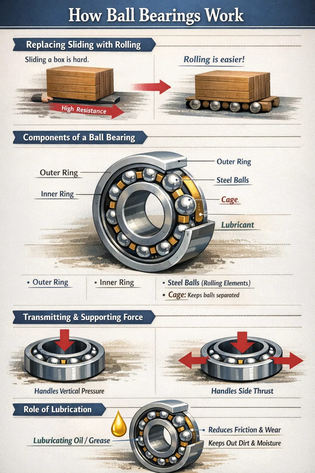 Ball bearings work in the same way. They use small, smooth balls inside to transform the intense "friction" between parts into smooth "rolling."