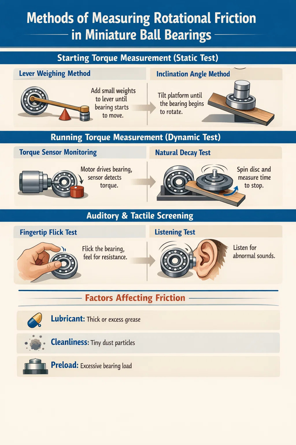 Measuring the rotational friction of miniature ball bearings essentially involves measuring the resistance torque they generate during rotation. Due to the small size and extremely low friction of these bearings, conventional measurement methods are often not sensitive enough.