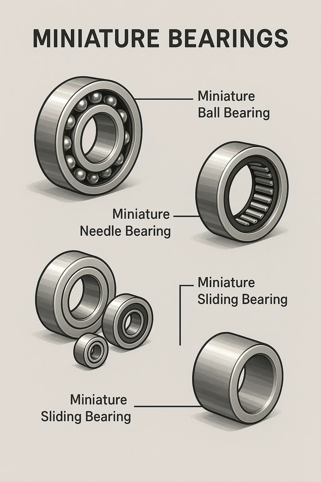 --Miniature Ball Bearings: This is the most common type of miniature bearing. It works by using tiny, hard balls (usually steel or ceramic) rolling in the tracks (raceways) of the inner and outer rings. We discussed how they work in detail earlier.